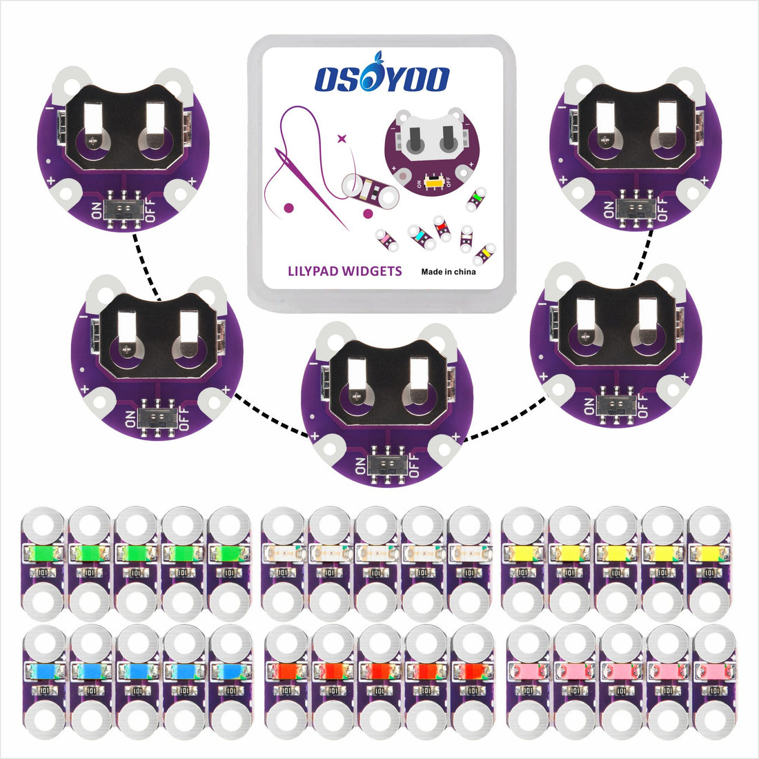 5X Lilypad Coin Cell Battery Holder+5X Six Color Lilypad LEDs Pink/Red/Yellow/Blue/Green/Orange for Arduino Raspberry Pi Microcontroller board