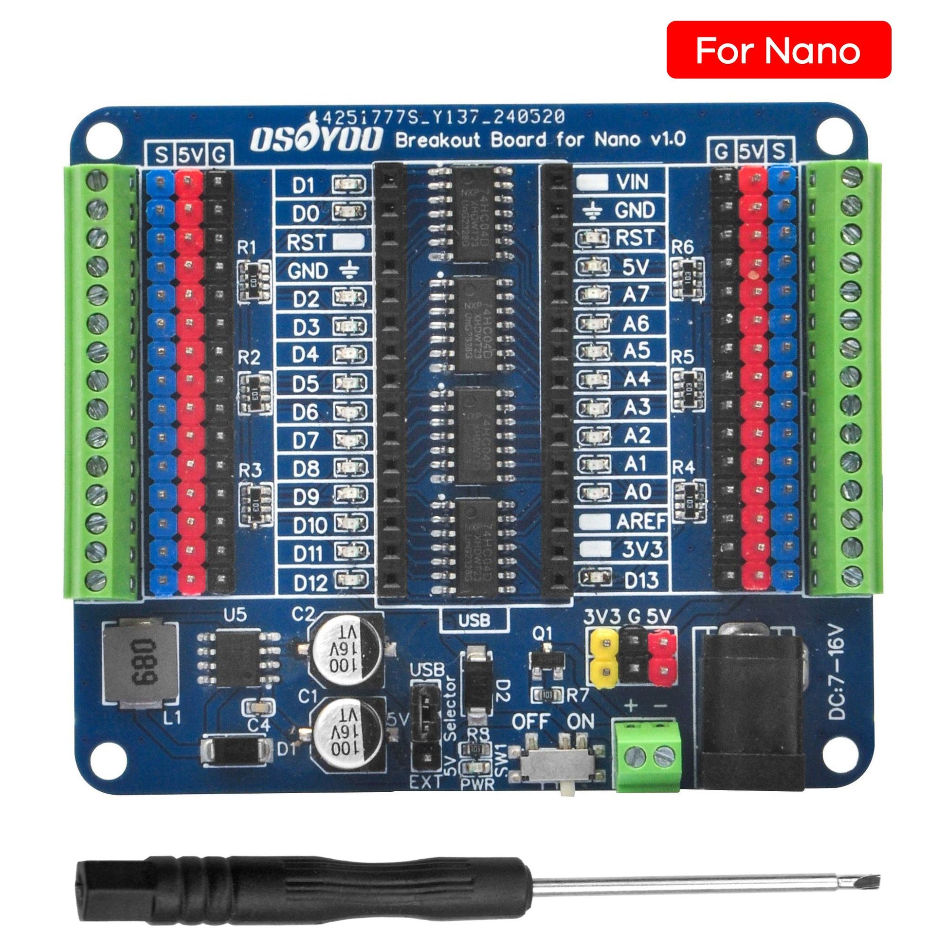 OSOYOO Nano Breakout Board,GPIO Status LED,I/O Shield,Terminal Expansion block for Arduino Nano, 5V 3.3V Outputs