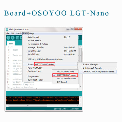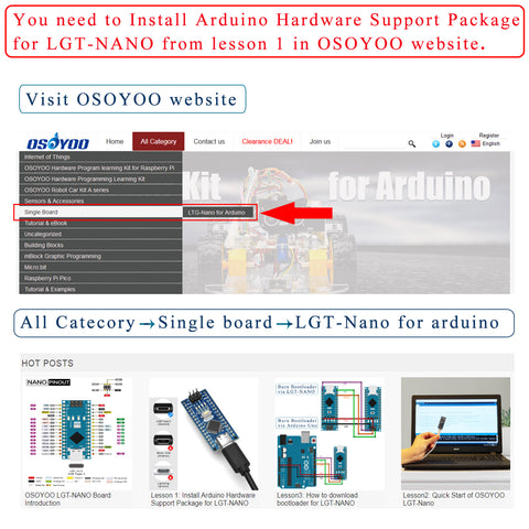 You need to Install Arduino Hardware Support Package for LGT-NANO from lesson 1 in OSOYOO website before using.